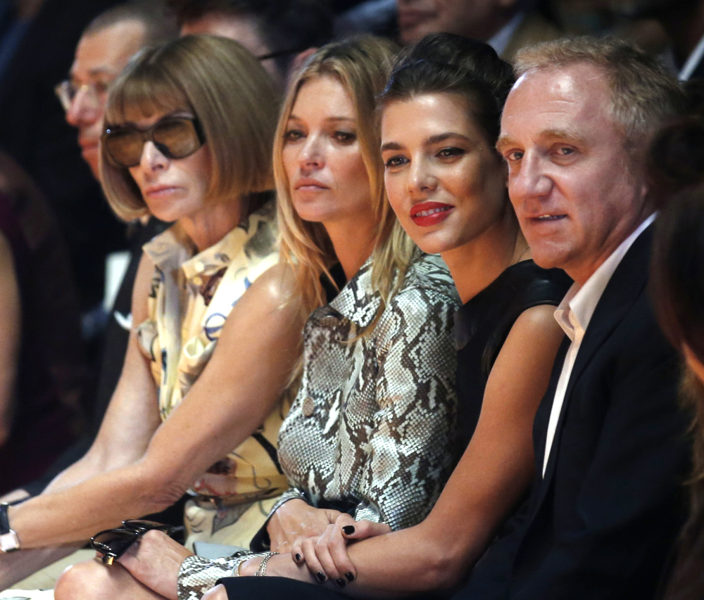 From left, editor-in-chief of American Vogue Anna Wintour, model Kate Moss, Princess Charlotte Casiraghi, and French businessman Francois Pinault attend Gucci women’s spring-summer 2015 show, part of the Milan Fashion Week, unveiled in Milan, Italy, Wednesday, Sept. 17, 2014. (AP Photo/Luca Bruno) ORG XMIT: XLB120